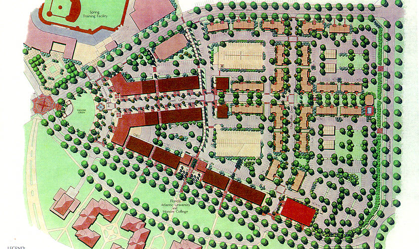 Abacoa is a spectacular master plan community located in Jupiter, Florida. During its initial stages, I was a production homebuilder, working closely with Abacoa's visionary developer, George Di Guardiola. Regrettably, a downward real estate cycle put the visionary project under pressure in the late 90s, impacting the overall design intent of the downtown.